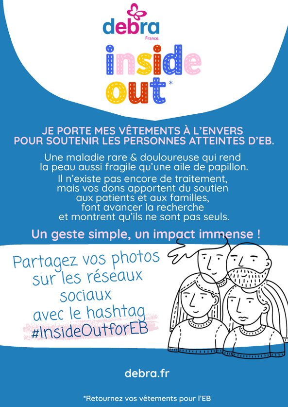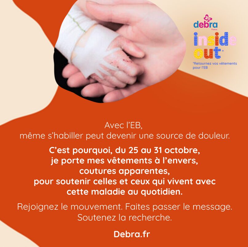 À l’occasion de la semaine internationale de sensibilisation à l’épidermolyse bulleuse (EB), du 25 octobre au 1er novembre 2025, Debra France et Debra International s’unissent à nouveau autour de la campagne mondiale Inside Out — une initiative symbolique et universelle pour rendre visible l’invisible : la douleur quotidienne, physique et émotionnelle, des personnes atteintes d’épidermolyse bulleuse.