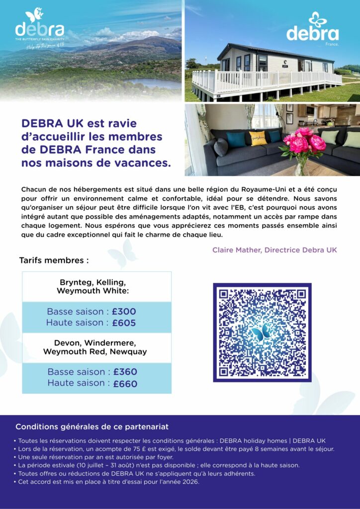 Offre réservée aux adhérents Debra France à jour de leur adhésion 2026.
